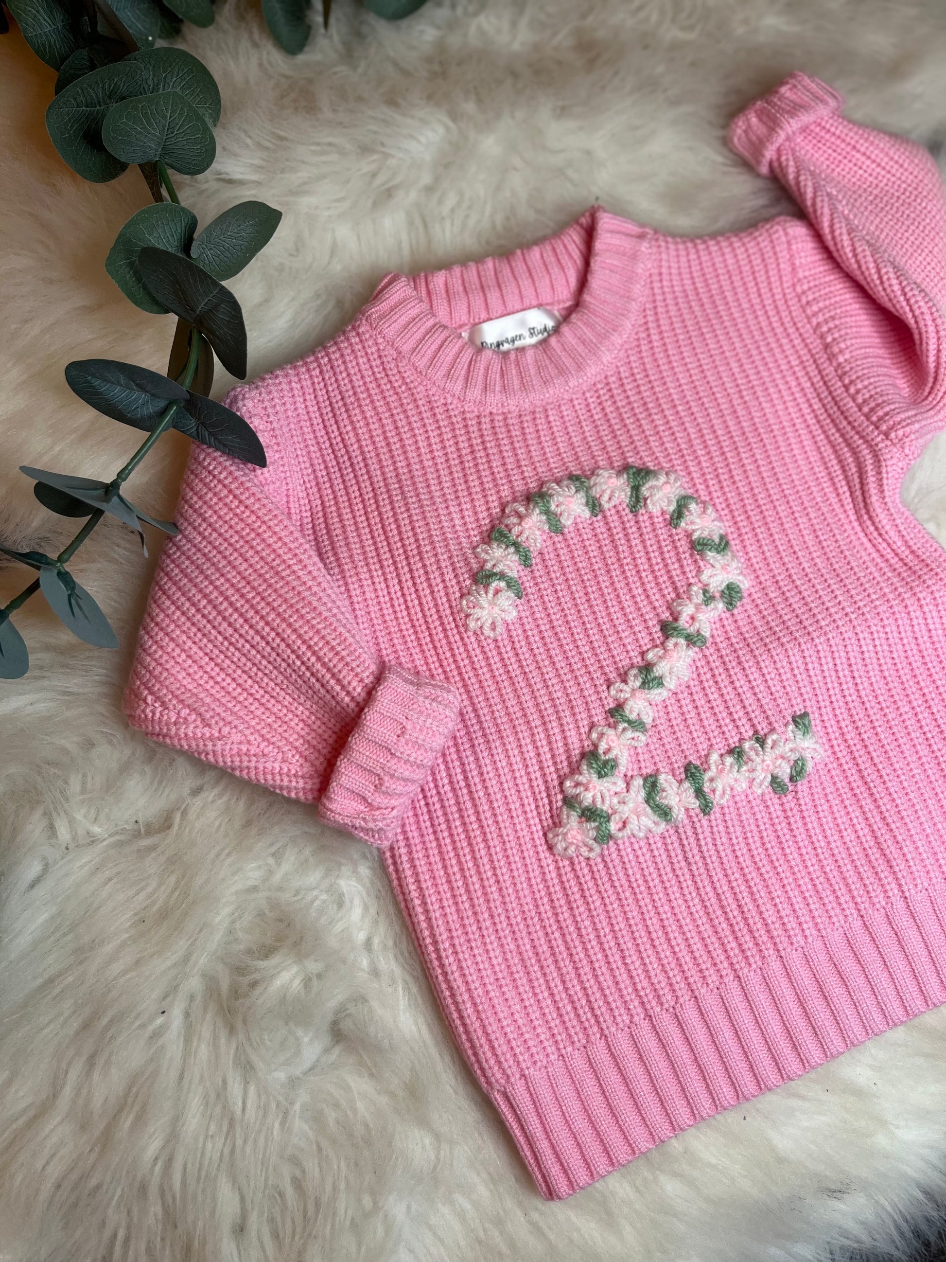 Mjuk stickad tröja i rosa med valfri broderad text framtill. Bekväm passform som passar perfekt för vardag och lek.
